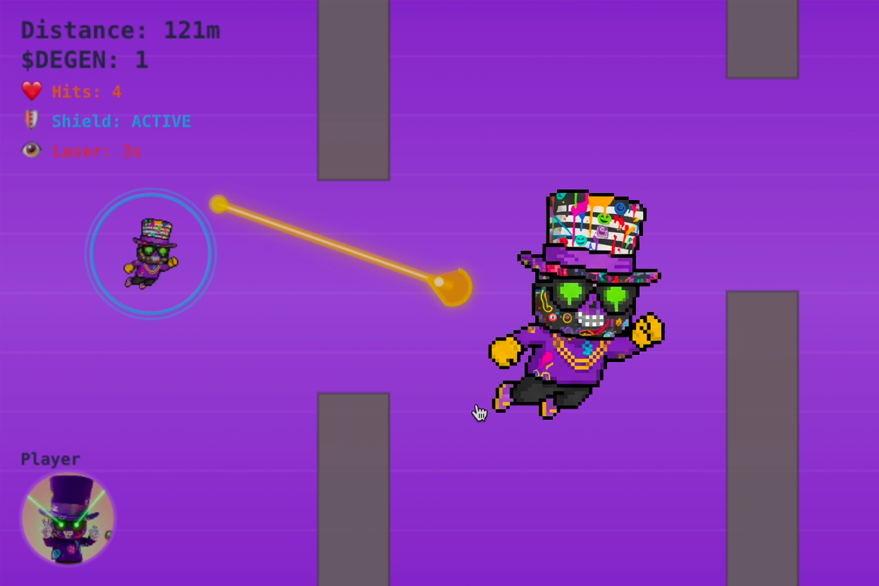 Fly through obstacles, collect hats, and rack up DEGEN tokens! Real DEGEN rewards requires a Based Degen NFT. Mint one or buy on secondary market.
